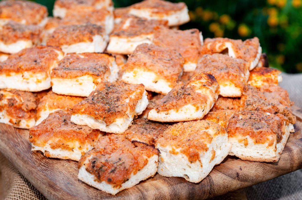 The name derives from the Greek spòngos, sponge: the dough of this focaccia, in fact, is thick and soft, spongy, then seasoned with abundant tomato sauce, anchovies, oregano, caciocavallo and onions.