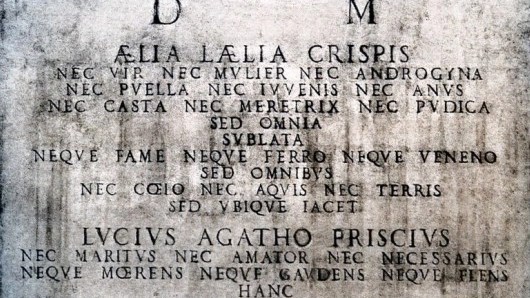 it is a false funerary inscription dedicated by a man, hidden behind the pseudonym of Lucius Agatho Priscius, to a woman called Aelia Laelia Crispis.
